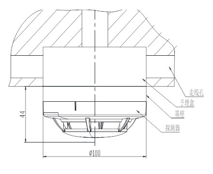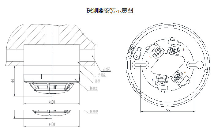 探測器底座示意圖如圖6所示。底座上有2個導(dǎo)體片,片上帶接線端子。穿線管內(nèi)的探測器總線分別接在2和3兩個接線端子上(不分極性)。待底座安裝牢固后,將探測器底部對正底座順時針旋轉(zhuǎn),即可將探測器安裝在底座上。