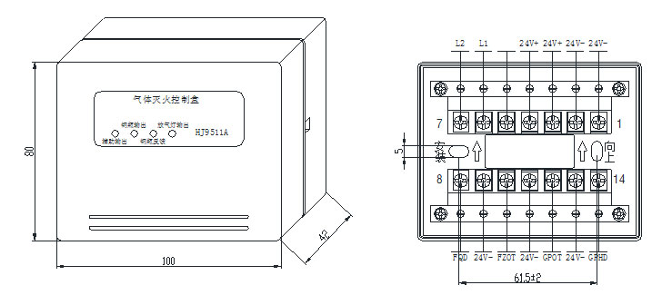 HJ9511A氣體滅火終端盒(以下簡稱終端盒),是HJ600C氣體滅火控制裝置的重要部件,應(yīng)用時與氣體滅火設(shè)備的啟動電磁閥和壓力開關(guān)進行連接。可完成對氣體滅火啟動、反饋和線路檢測。